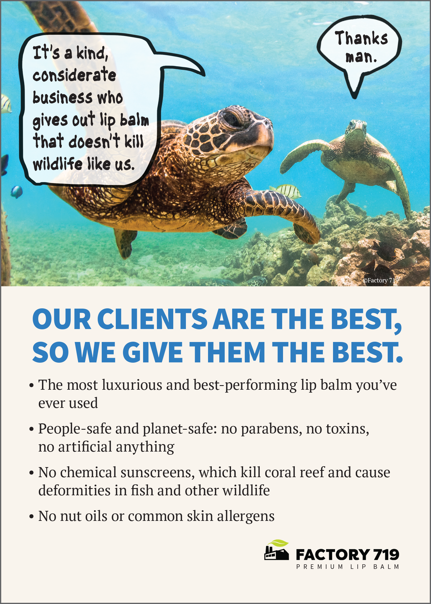 By giving your clients and potential clients Factory 719 reef-safe and groundwater-safe lip balm, you’re telling people you value our environment, your clients’ health and their childrens’ health.